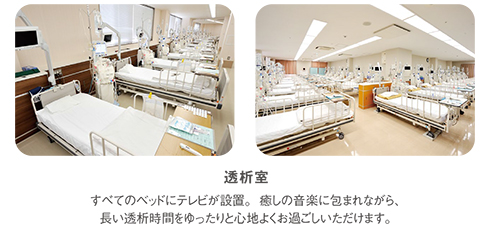 明生会の透析室では、患者様に御安心いただくため、家庭的なベテランスタッフが寄り添います。室内には癒しの音楽が流れ、全てのベッドには液晶テレビを設置しておりますので、長い透析時間もゆったり心地よくお過ごしいただけます。